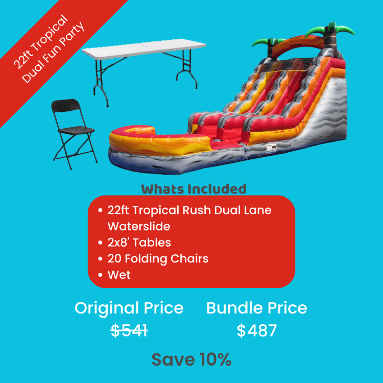 22 FT TROPICAL RUSH DUAL LANE WATER SLIDE22ft Tropical Dual Fun Party Bundle:22 FT TROPICAL RUSH DUAL LANE WATER SLIDE1Dropdown13216007_3087055110 FREE DELIVERY + NO FEES