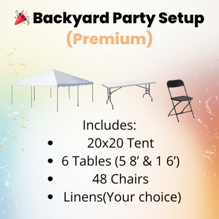 20' x 20' Weekender West Coast Frame Party Tent - Seats 40Backyard Party Setup (Premium):20' x 20' Weekender West Coast Frame Party Tent - Seats 401Dropdown13182669_3087099110 6' FT Plastic Folding Table - Seats 6 - 8Backyard Party Setup (Premium):6' FT Plastic Folding Table - Seats 6 - 81Dropdown23182669_30871111106 FT table can hold up to 8 children or 6 adults. Table Cloth (White)Backyard Party Setup (Premium):Table Cloth (White)103182669_3087111_31826850000A crisp white tablecloth that adds a clean, polished look to any event. Made to cover standard banquet or folding tables, it hides imperfections and creates a neat, uniform surface for dining, displays, or buffet setups. Its neutral color complements any décor, from casual backyard gatherings to formal receptions, making table settings look coordinated and refreshing. Easy to drape and smooth, it helps protect tabletops from spills and scratches while providing a fresh backdrop for centerpieces, place settings, and food service. Ideal for rental use where quick, attractive table coverage is needed. Tablecloth (Black)Backyard Party Setup (Premium):Tablecloth (Black)103182669_3087111_31826830000A crisp, black tablecloth sized to fit an 8-foot banquet table. Made to provide a clean, professional look for weddings, corporate events, fundraisers, or backyard parties, it drapes fully over the tabletop for a neat, uniform appearance. The dark color conceals minor stains and pairs easily with any décor or centerpiece. Ideal for rental when you want a simple, elegant covering that creates a polished presentation without fuss. Tablecloth (Orange)Backyard Party Setup (Premium):Tablecloth (Orange)103182669_3087111_31502330000A sleek, fitted spandex cover designed to transform a standard 8-foot rectangular table into an elegant, streamlined focal point. In a rich royal blue, the stretchy fabric pulls snugly over the table top and legs for a smooth, wrinkle-resistant finish that stays tidy through events. Its contoured fit creates clean lines and a modern silhouette, making it ideal for trade shows, banquets, corporate meetings, weddings, and any occasion where a polished presentation matters. Lightweight and easy to slip on or remove, it packs compactly for transport and storage. Simple to clean and quick to launder, this cover offers an instant style upgrade while keeping the table protected and looking uniformly refined. Tablecloth (Royale Blue)Backyard Party Setup (Premium):Tablecloth (Royale Blue)103182669_3087111_31635330000A rich royal blue polyester tablecloth sized 90" x 132" made to fit an 8-foot rectangular table with graceful overhang. The durable, wrinkle-resistant polyester drapes smoothly to create a neat, uniform presentation while protecting the tabletop. Lightweight and easy to place or remove, it folds compactly for transport and storage and tolerates routine laundering for quick turnaround between events. Elegant enough for weddings, banquets, and corporate functions yet practical for trade shows and meetings, this tablecloth instantly elevates a table’s look with a polished, consistent finish. 8' Plastic Banquet Table - Seats 8-10Backyard Party Setup (Premium):8' Plastic Banquet Table - Seats 8-101Dropdown43182669_31475291100A sturdy 8-foot rectangular plastic banquet table that folds in half for fast transport and compact storage — designed to seat eight comfortably for dinners, meetings, or event workstations. Built from a durable, easy-clean plastic top with reinforced edges, it offers a flat, stable surface for plates, laptops, centerpieces, or catering trays. The folding mechanism locks the two halves securely into place and folds down to a convenient size that fits most vehicles and storage spaces. Lightweight enough for two people to carry yet rigid enough for repeated rental use, this table is practical for banquet halls, outdoor events, corporate functions, classrooms, and backyard gatherings where a reliable, simple setup is needed. Easy to wipe clean between rentals and neutral in appearance to suit formal and casual themes alike. Table Cloth (White)Backyard Party Setup (Premium):Table Cloth (White)103182669_3147529_31826850000A crisp white tablecloth that adds a clean, polished look to any event. Made to cover standard banquet or folding tables, it hides imperfections and creates a neat, uniform surface for dining, displays, or buffet setups. Its neutral color complements any décor, from casual backyard gatherings to formal receptions, making table settings look coordinated and refreshing. Easy to drape and smooth, it helps protect tabletops from spills and scratches while providing a fresh backdrop for centerpieces, place settings, and food service. Ideal for rental use where quick, attractive table coverage is needed. Tablecloth (Black)Backyard Party Setup (Premium):Tablecloth (Black)103182669_3147529_31826830000A crisp, black tablecloth sized to fit an 8-foot banquet table. Made to provide a clean, professional look for weddings, corporate events, fundraisers, or backyard parties, it drapes fully over the tabletop for a neat, uniform appearance. The dark color conceals minor stains and pairs easily with any décor or centerpiece. Ideal for rental when you want a simple, elegant covering that creates a polished presentation without fuss. Tablecloth (Orange)Backyard Party Setup (Premium):Tablecloth (Orange)103182669_3147529_31502330000A sleek, fitted spandex cover designed to transform a standard 8-foot rectangular table into an elegant, streamlined focal point. In a rich royal blue, the stretchy fabric pulls snugly over the table top and legs for a smooth, wrinkle-resistant finish that stays tidy through events. Its contoured fit creates clean lines and a modern silhouette, making it ideal for trade shows, banquets, corporate meetings, weddings, and any occasion where a polished presentation matters. Lightweight and easy to slip on or remove, it packs compactly for transport and storage. Simple to clean 