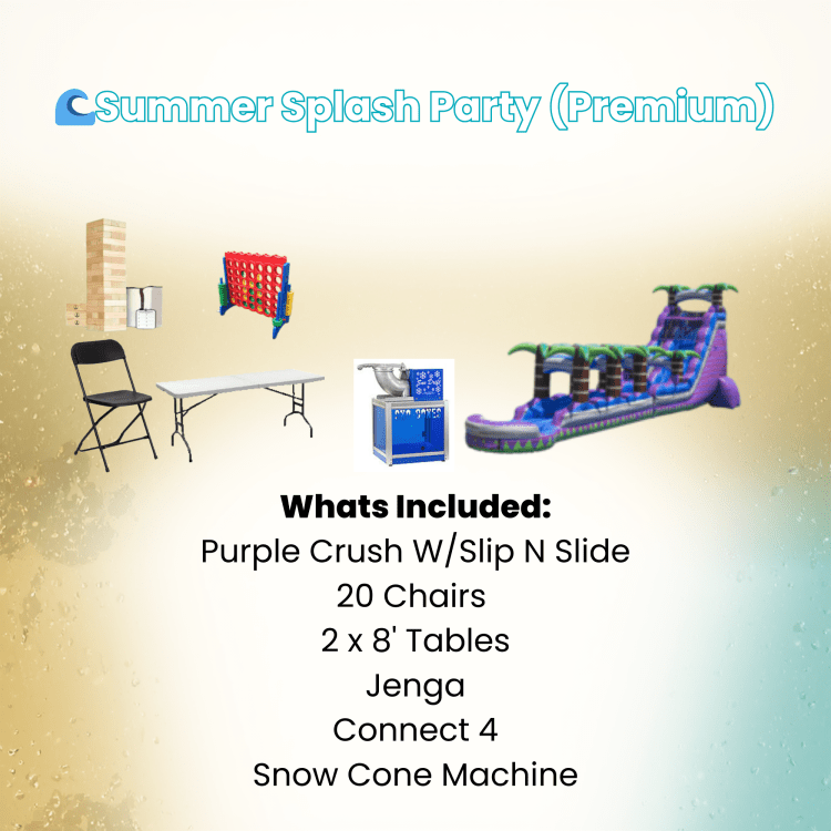 For 2 Days$469 Purple Crush Slip N SlideTropical Summer Splash Party (Premium):Purple Crush Slip N Slide113215985_3087047_31029891100Purple Crush Slip N Slide — a vibrant, tropical-themed water slide that turns any backyard into a splash-ready party zone. This accessory pairs with the 22 ft Purple Crush water slide to add an extended slip-and-slide run: long enough for fast, wet races and breezy glides, bordered by inflatable palm accents that keep the look fun and island-inspired. Designed for easy setup as part of the full slide system, it gives riders a smooth, wet landing and extra play space without taking over your yard. Perfect for birthday parties, poolless summer fun, or any event where guests want a safe, exciting water run — just attach to the main slide, add water, and let the sliding begin. Party Seating and Games (Most Popular)Tropical Summer Splash Party (Premium):Party Seating and Games (Most Popular)1Dropdown13215985_32140231100 Free Delivery